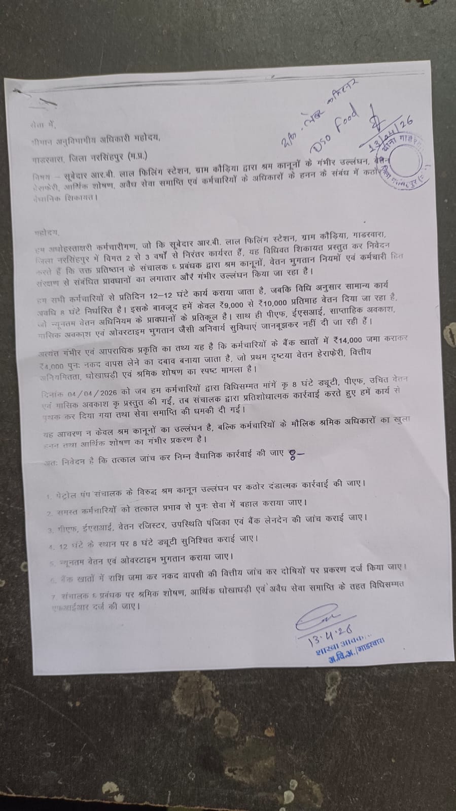 गाडरवारा। ग्राम कौड़िया स्थित सूबेदार आर.बी. लाल फिलिंग स्टेशन के कर्मचारियों ने पेट्रोल पंप संचालक पर श्रम कानूनों के गंभीर उल्लंघन, वेतन हेराफेरी और आर्थिक शोषण के आरोप लगाते हुए अनुविभागीय अधिकारी को कठोर शिकायत सौंपकर कार्रवाई की मांग की है।