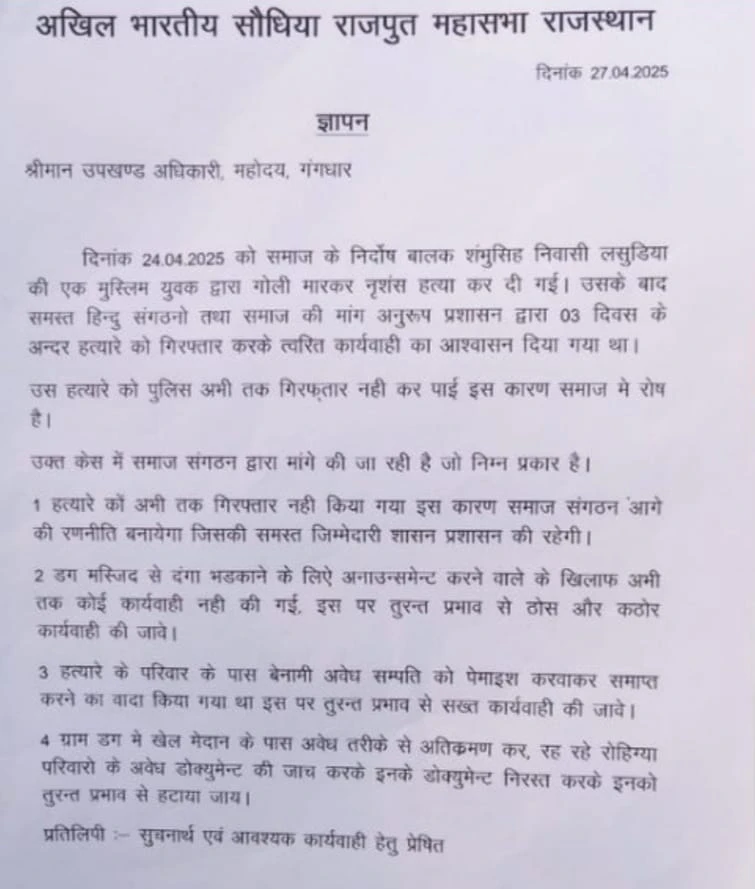 डग कस्बे गोली मारकर हत्या के मामले में सोधिया राजपूत समाज ने ज्ञापन सोपा गया है सोधिया समाज के राष्ट्रीय अध्यक्ष मानसिंह चौहान के नेतृत्व में ज्ञापन सोपा गया फरार आरोपी सोहेल खान की गिरफ्तारी को लेकर सोधिया समाज में आक्रोश है ज्ञापन में आरोपी की शीष गिरफ्तारी डग खेल मैदान के बाहर अवैध रूप से बसे रोहिंग्या मुसलमान को हटाने धार्मिक स्थलों से को भाषणों को रोकने और अन्य मांगें राखी गई इस दौरान सोधिया राजपूत समाज के कई लोग बड़ी संख्या में मौजूद रहे